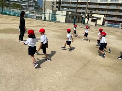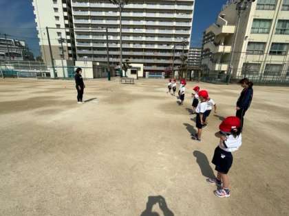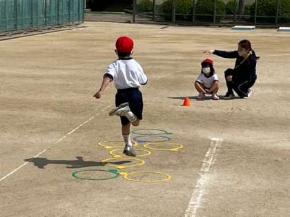 1年生の体育びらきでは、からだほぐしの運動遊びをしました。うさぎになったり、ケンパをしたりしました。