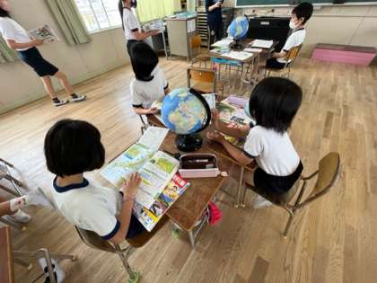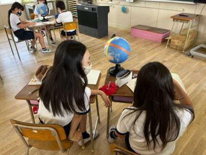 4年生は、社会科の時間に世界の国々の情報を集めていました。地球儀や地図帳、資料集を使い、国の場所や首都、面積などを調べていました。