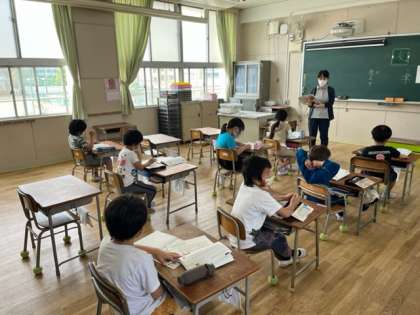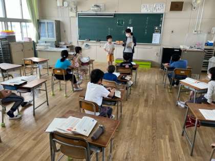 2年生の国語科の時間です。「すきなことなあに?」の単元で、2人で行うインタビュー形式の話す聞く学習です。初めは恥ずかしそうでしたが、これから上手になりますね。