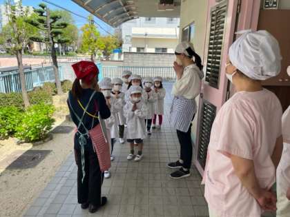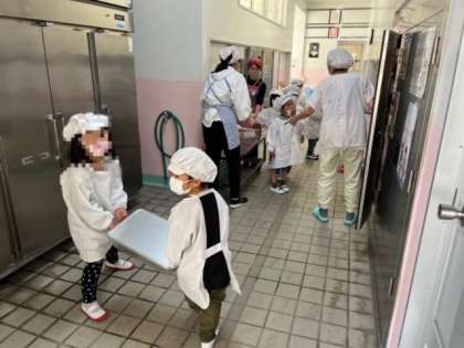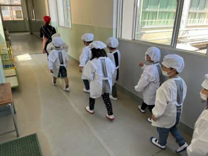 1年生も給食を運びます。みんなの分をがんばって運びます。配膳は先生がします。みんなは黙って待っています。配られると「ありがとう」て言えてるのはすごいね。