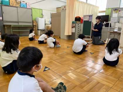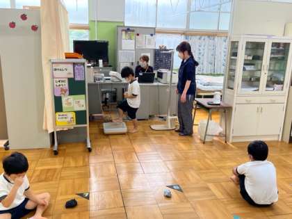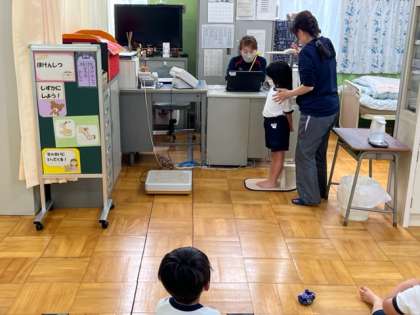 1年生のはじめての発育測定です。みんなで使う器具なので手も足も消毒をして、身長と体重を測りました。保健室での態度はさすが小学生ですね。