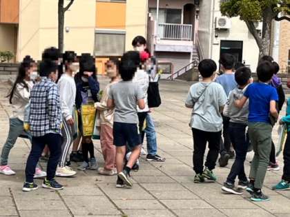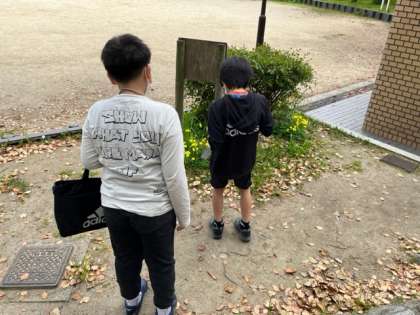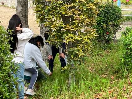 4年生の理科の時間。池島公園に春の生き物を探しに行きました。見つけた植物や動物の写真を撮っていました。