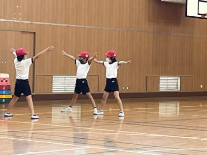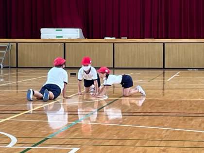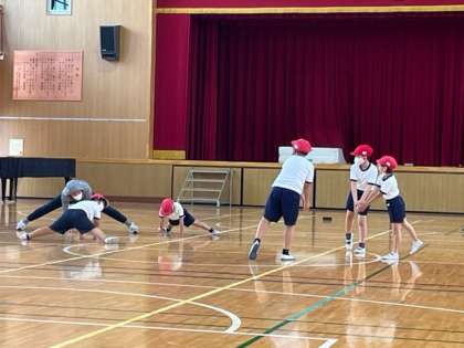 3年生は、からだほぐしの運動です。リーダーの動きをまねたり、移動の運動をしたりして楽しんでいました、