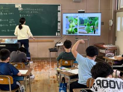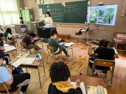 4年生が理科で観察していく、蔓性の植物「ヒョウタン」のたねを詳しく調べていました。色や形をよく見て観察カードに書きます。実がなるまで育てましょう。