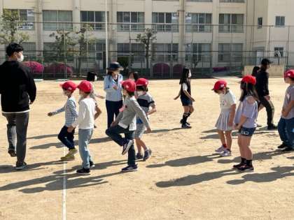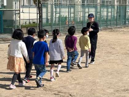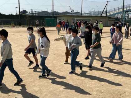毎月初めの月曜日は運動場での児童朝会です。今朝は校長先生の話の後、校歌を歌って、教室に戻る方法を学びました。