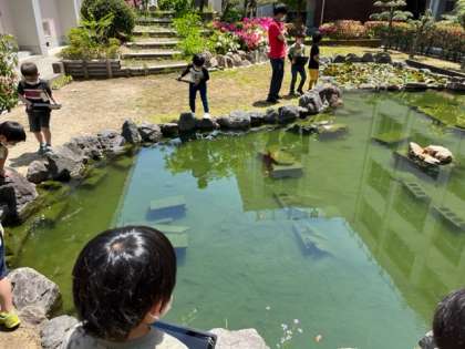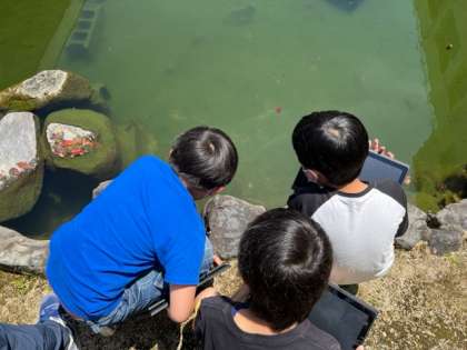 2年生が池の生き物を観察していました。メダカやザリガニ、金魚がたくさんいるのを見つけていました。