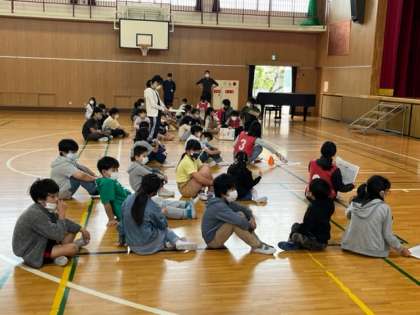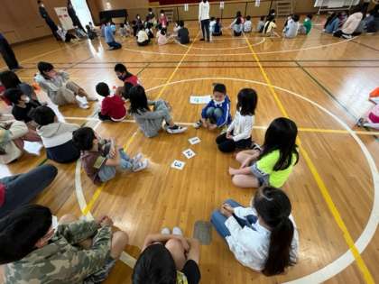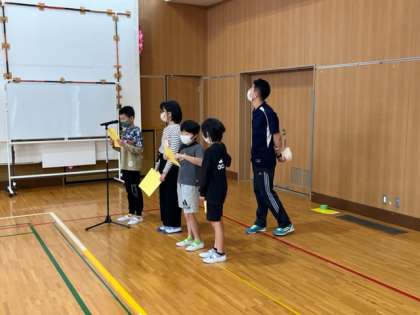 今朝は集会委員会が考えたゲーム集会です。カーテンの間を通るものを当てます。