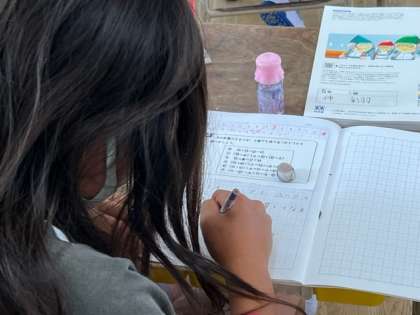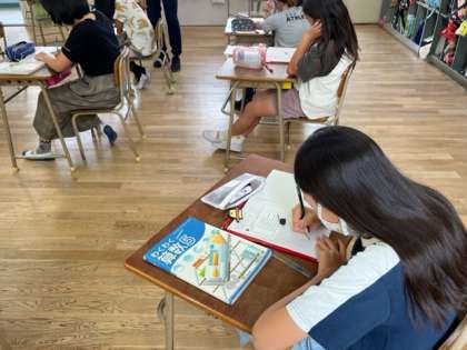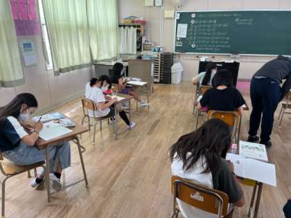 5年生は算数科の時間に小数の計算にも整数の時に使えた法則が当てはまるのかを検証していました。分配結合の法則や関数につながる大切な学習です。
