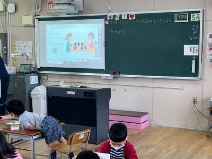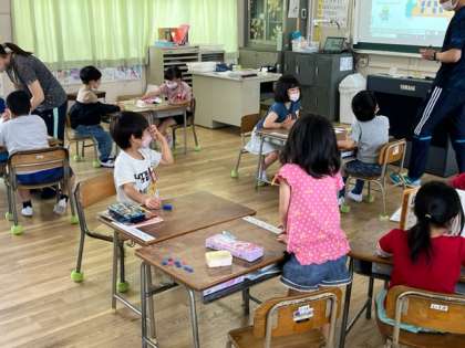 1年生が学習する数の概念に関する学習です。9という数の合成は何種類あるのか子供たちは遊びながら学びます。「2と7で9」ですって。すごいね。