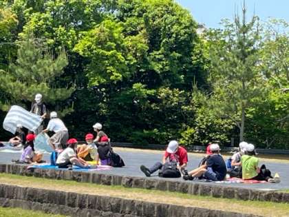 お弁当を食べる場所に移動します。広場でお弁当の時間です。