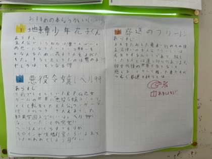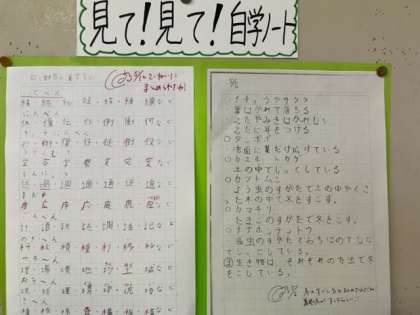 5年生の自学ノートが掲示されています。自分で学習内容を決めて、調べたり考えたりして作られています。問題解決の素晴らしい学びです。