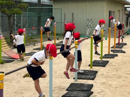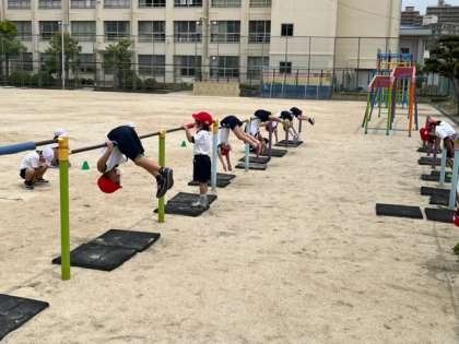 1.2年生が体育科の時間に鉄棒遊びをしていました。つばめ、自転車こぎ、ダンゴムシ、コウモリなどいろいろ技を使ってあそびます。みんな上手でびっくりしました。