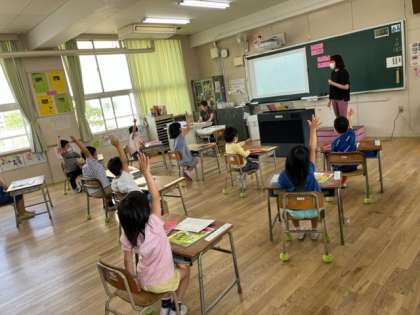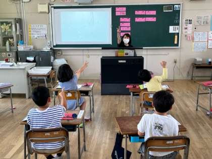 1年生が元気に「じゃんけんぽん」と歌を歌ったり、カスタネットやタンバリンでリズム遊びをしたりしていました。今日は学校で、初めてタンバリンを使います。とても上手にできていました。