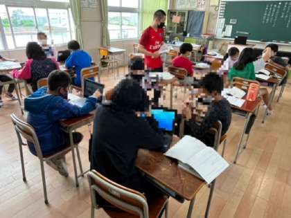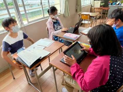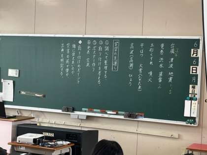 6年生の国語科の時間に、「防災新聞を作る」学習をしていました。手分けして、台風、地震、落雷に関する内容で作ります。端末は情報収集に使うようです。