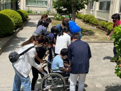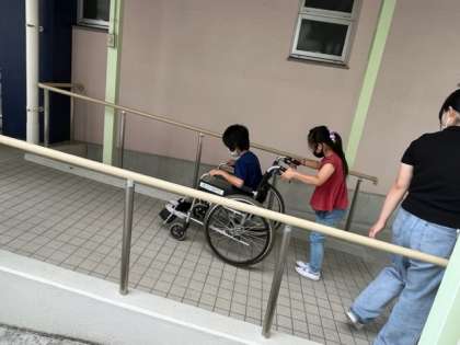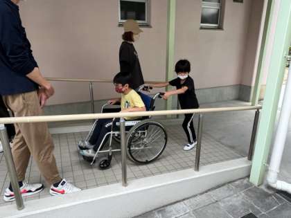 スロープを降りる、段差を上るのもとても力がいます。大人に手伝ってもらってやっと動かせていました。