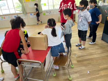 箱の中身を当てましょう。何が飛んだ?などのクイズ形式の遊びも、みんなが楽しめる工夫がすばらしいです。