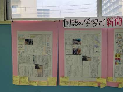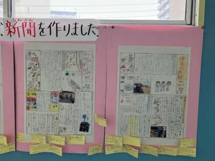4年生が国語の時間に作っていた新聞が掲示されていました。黄色い付箋は「よいところ」をコメントしたものです。
