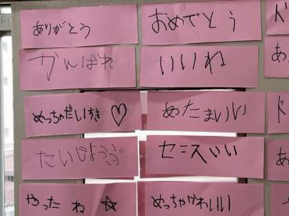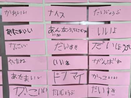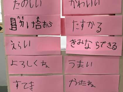 1年生の教室に「なかよしことば」が掲示されていました。とてもすてきな言葉がいっぱいです。