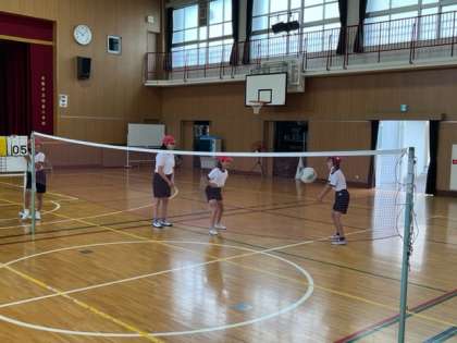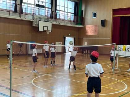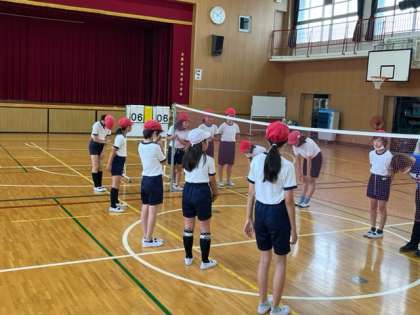5年生が「キャッチバレーボール」の試合をしていました。ボールを上にあげるのや、相手コートに返す技術などとてもレベルが高いです。