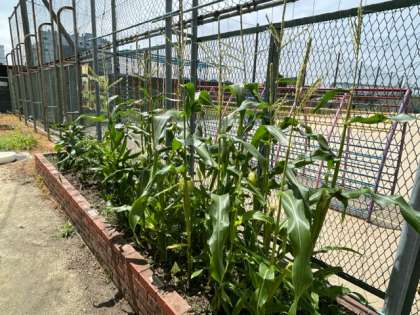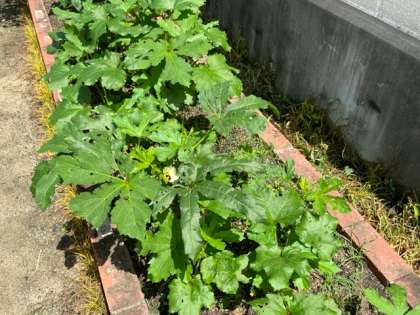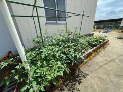 給食委員会の子どもたちが育てている夏野菜がずいぶん大きくなりました。オクラには花が咲いています。