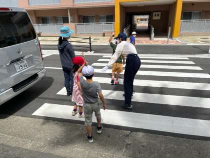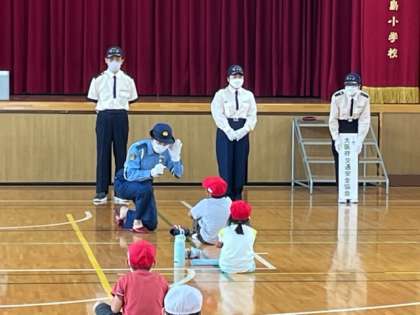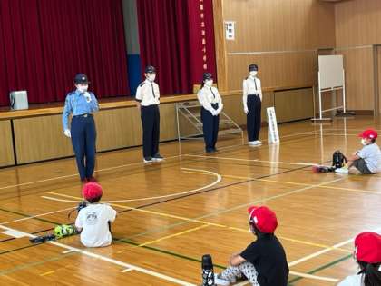 今日は1.2.3.4年生の交通安全教室です。大阪府に1チームしか無い交通安全委員会の方が来てくださいました。1.2年生は講堂でお話を聞いた後、実際に校区内で歩行の学習をしました。