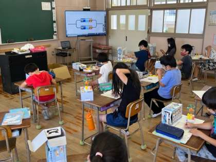 4年生の理科の時間に子どもたちは、電池の直列と並列の時の違いについて学んでいました。実験用具のプロペラの回り方の違いから予測します。