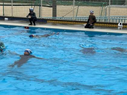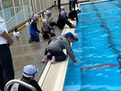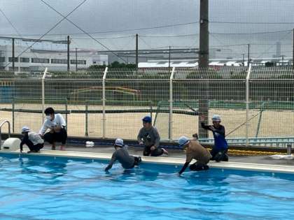 小雨の中、5.6年生が着衣水泳をしました。服を着たままで、水に落ちた時脱力して浮くのはとても難しいようです。