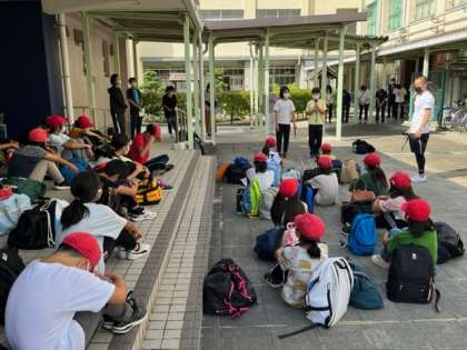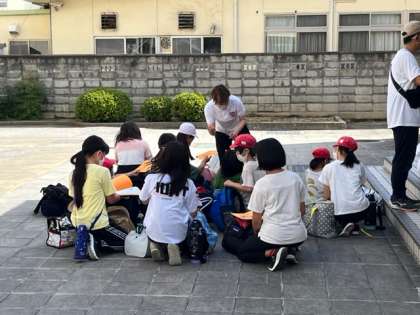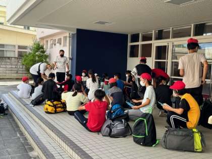 今日から5.6年生合同で林間学習に出かけます。出発前には健康観察を行って、いよいよ出発式です。
