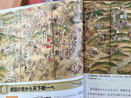 6年生が歴史の学習で、戦後大名について調べていました。長篠の戦いの絵図から時代の流れを読み解きます。