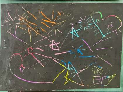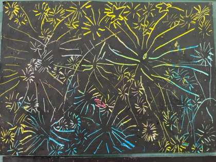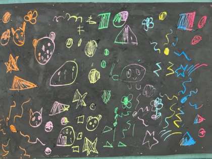 1年生に図工の作品です。パスで下地にたくさんきれいな色を塗ったので、仕上がりがとてもきれいですね。