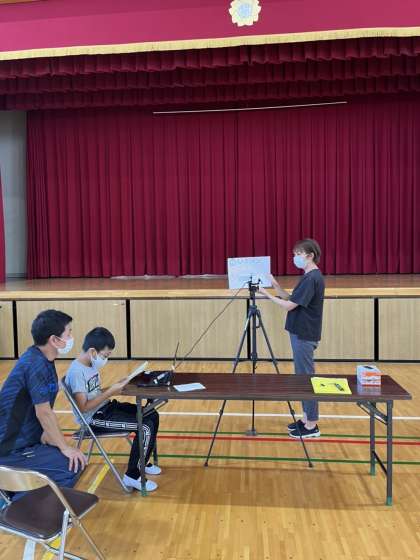 集会委員会の子どもたちは講堂から配信します。ジェスチャーをする人、放送する人と役割を分けて配信しました。