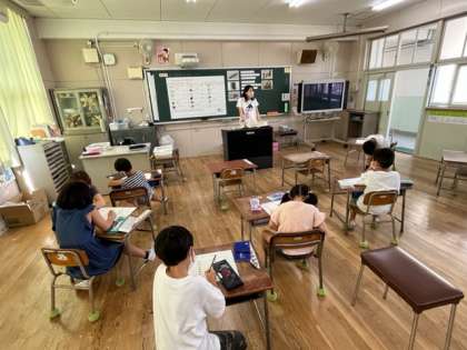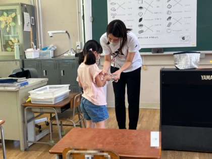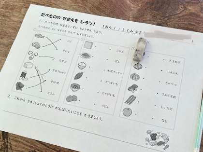1年生の食育の学習です。食べ物の名前クイズやのあと、学校で採れた本物の野菜の感触を確かめました。その後、赤黄緑の食品について知りました。