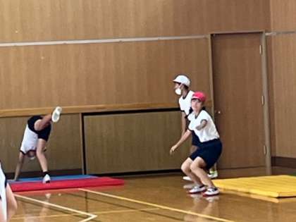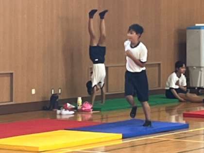 6年生が講堂で「マット運動」をしていました。倒立からの倒立前転と言う技に取り組んでいました。