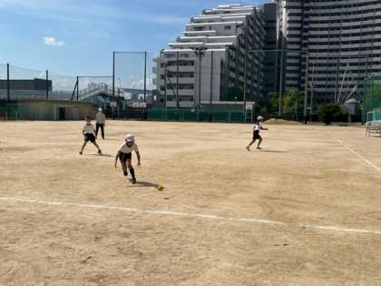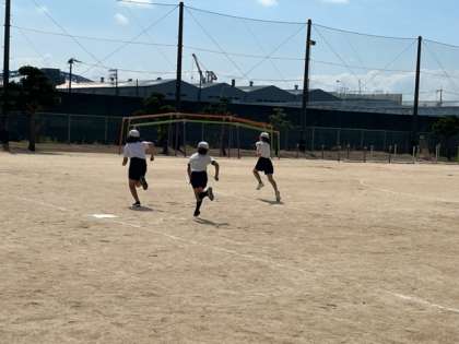 5年生が体育科の授業で「ティーベースボール」をしていました。思い切り打って、一生懸命にボールを追いかけていました。連携プレーも巧みです。