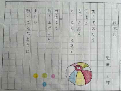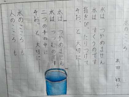 5年生の視写です。どちらの詩も心にグッとくる作品です。黒田三郎も高田敏子も、昭和を代表する詩人です。子どもたちの文字の美しさが引き立ちます。