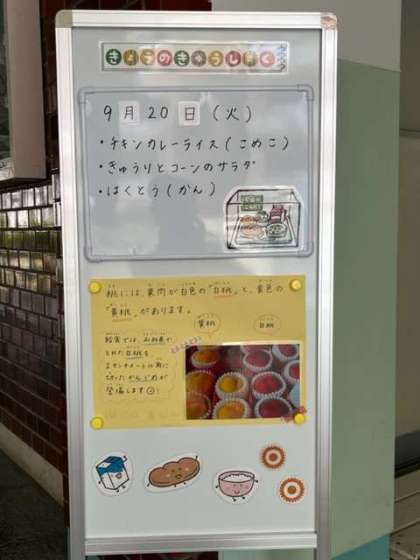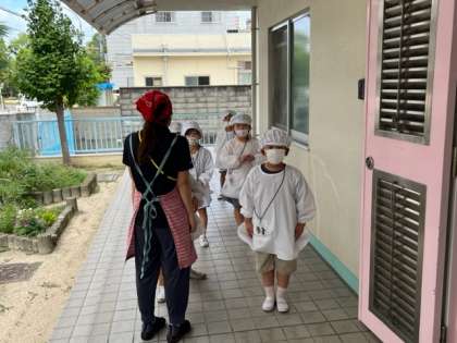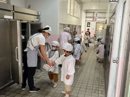 1年生が給食室に来ています。今日はカレーライスです。しっかり食べてね。