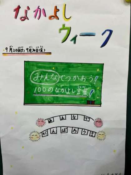 今週から「なかよしウィーク」が始まります。代表委員会の呼びかけで、100のなかよしことばをたくさん使い、もっともっと仲良くなりましょうという企画です。