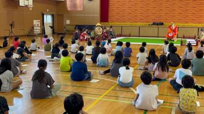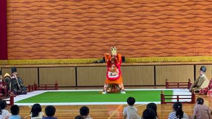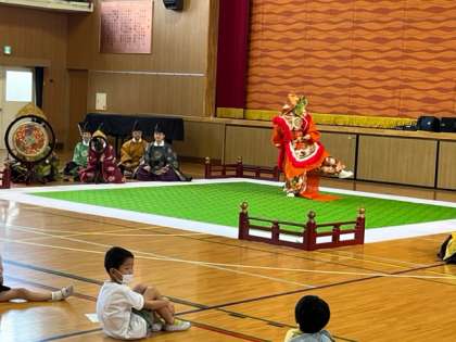 舞楽という舞を見せてくださいました。雅楽の演奏に合わせて舞う姿はとても幻想的です。子どもたちも前のめりになって見ている子、少し怖くて下がってしまった子といろいろでした。