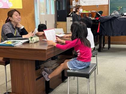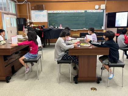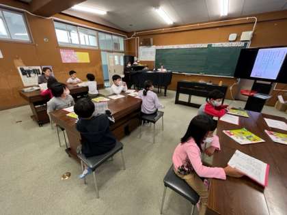 1年生が音楽の時間に運動会の歌を練習していました。赤紙も白組もしっかり覚えてください。