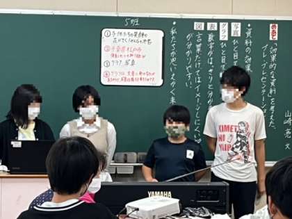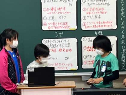 班ごとに発表します。池島地域をどんな町にしていけば良いのか?他都市の実例を使う発表にするという予告です。本番の発表会が楽しみです。