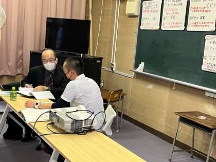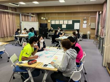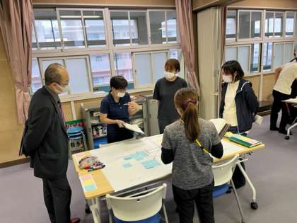 6年生の授業を受けて研究会を行いました。教員も懸命に研修しています。大学の先生にも来ていただき、指導を仰ぎました。