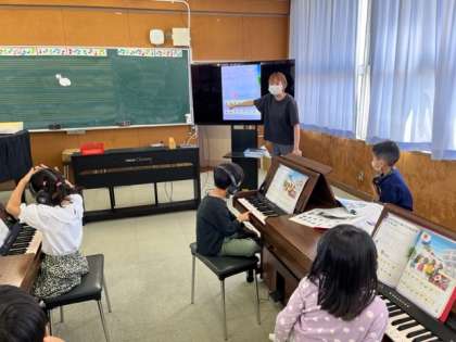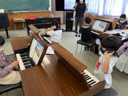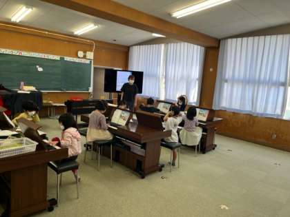 1年生は、音楽の時間に運動会の歌、校歌を練習して、鍵盤の学習もしていました。指をかえて演奏するのは難しいですね。