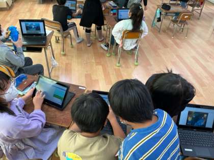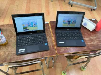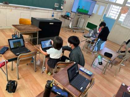 3年生が総合的な学習の時間に「スクラッチ」を使って、ゲームを作っていました。お互いに披露し合っていました。