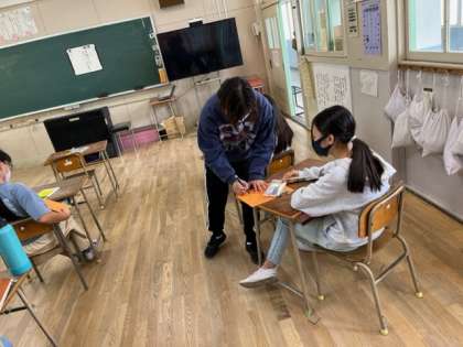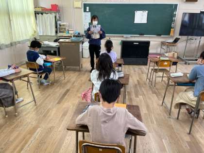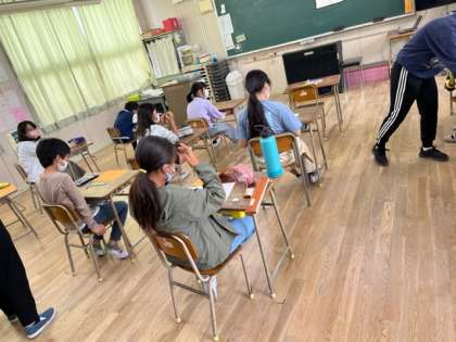 5年生の朝の時間です。1時間目ご始まる前にには、健康観察票を確認して、今日の予定を子どもたちに伝えています。静かに1日が始まります。