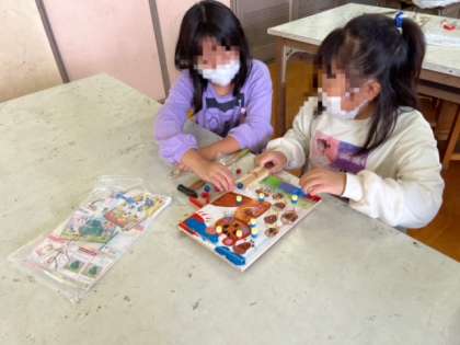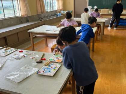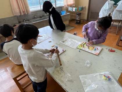 3年生が図工科の時間に釘を打って、かわいいゲームを作っていました。できた人は友達とゲームを楽しんでいました。