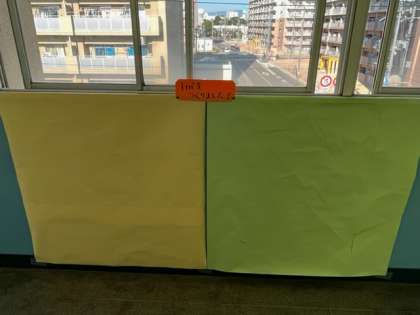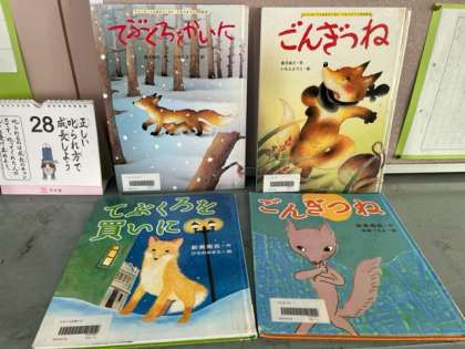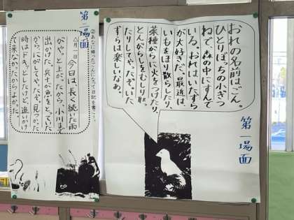 4年生の教室や廊下に学習の環境といえるものがあります。ごんぎつねを学習しているので、新美南吉の本、学習のワークシート、算数で作った1平方メートルの大きさの紙。感性や量感を育てるのにいいですね。