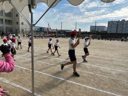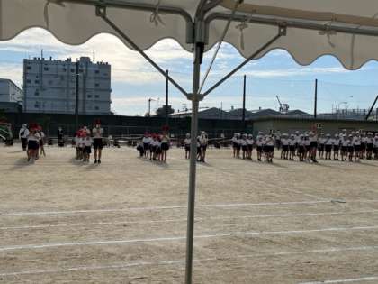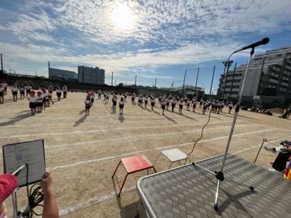 プラカード係の児童も緊張気味です。秋晴れのもと、全員整列しました。