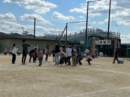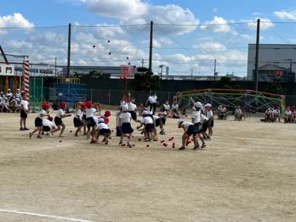 2回戦目はおとなと子供で玉入れをします。大人も負けずに真剣に玉を入れていました。