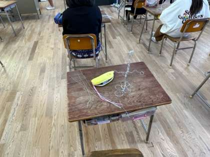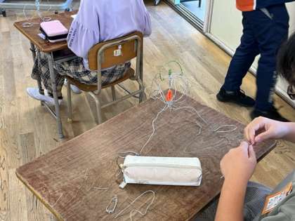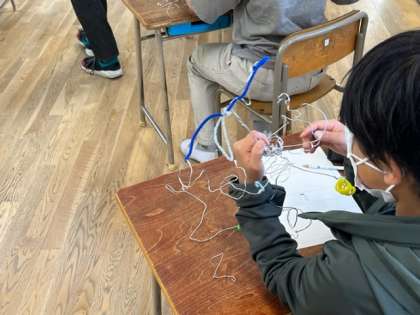 5年生の図画工作の時間です。針金を曲げたりつなげたりして作る「針金アート」をしていました。どんなタイトルがつくのかな?