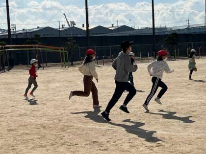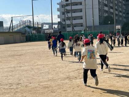 次に運動場への一次避難です。人数を確認した後、高所への移動をします。